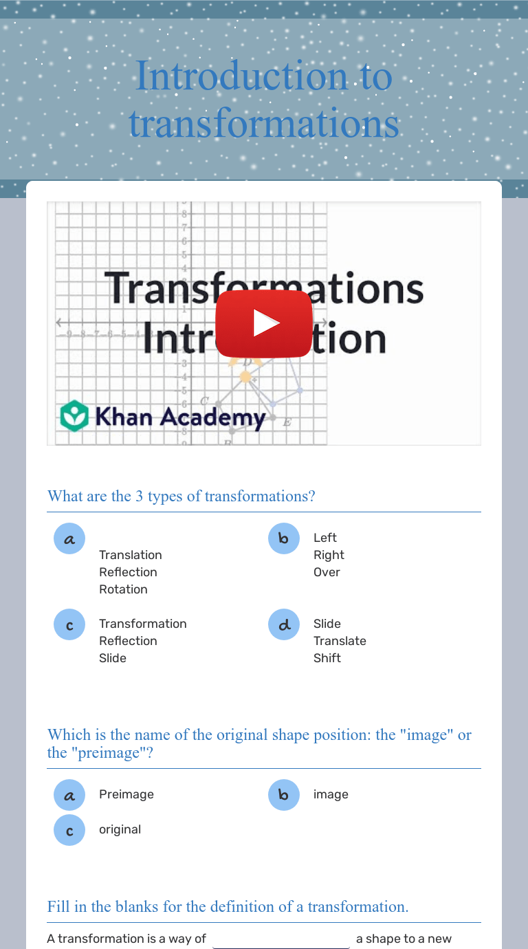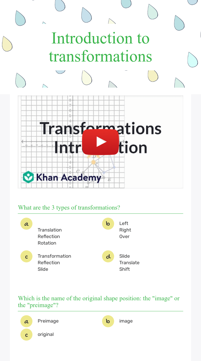 Intro To Geometric Transformations Video Khan Academy from img.youtube.com The worksheet could also be used independent of the powerpoint lesson with a visualiser! Define reflection, rotation, translation, and dilation . Rotation ks3 walkthrough worksheet · 4.8 (5 reviews) · transformations: Please write a definition for each of the underlined words. You will be using a graphing calculator (or online . These geometry worksheets will create various types of problems about translation, rotation, and reflection. Complete the intro to transformations 1 worksheet which walks you through these basic transformations. Dilations are not rigid transformations because, while they .